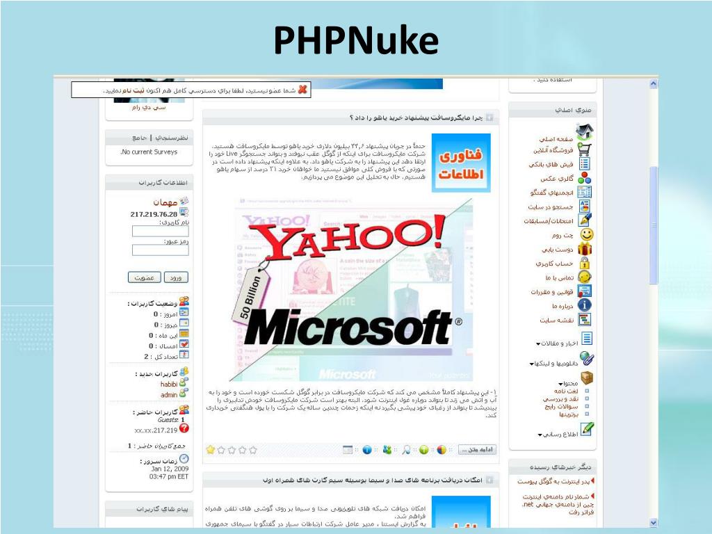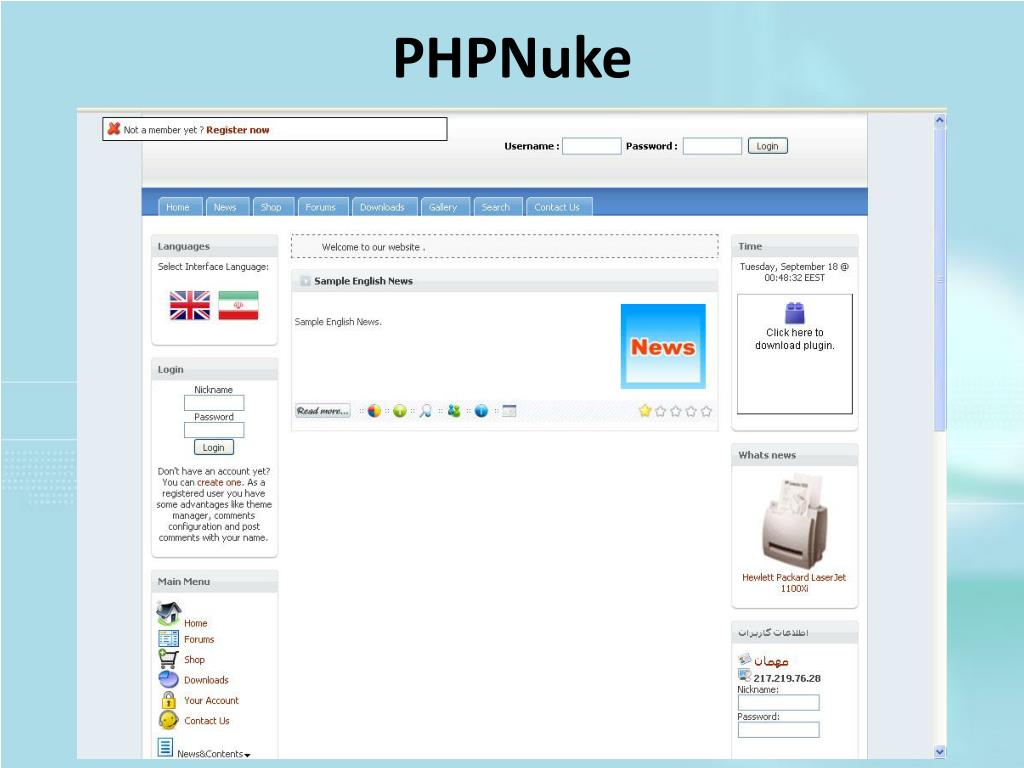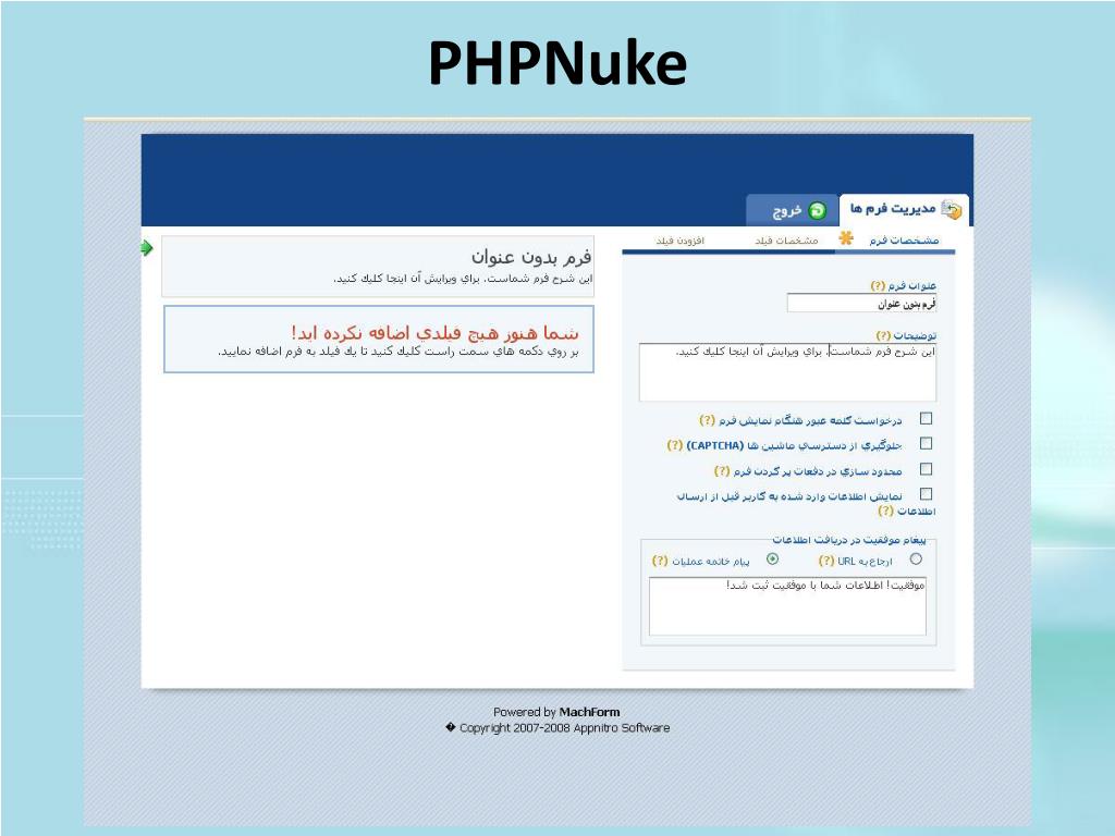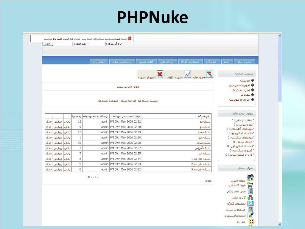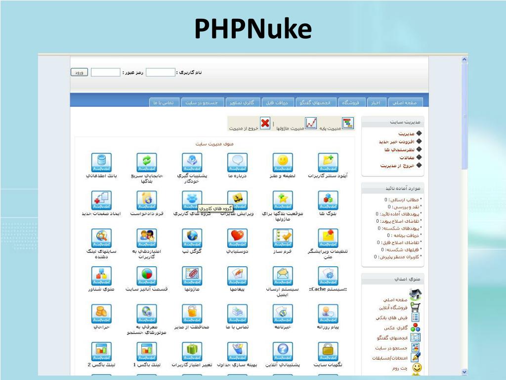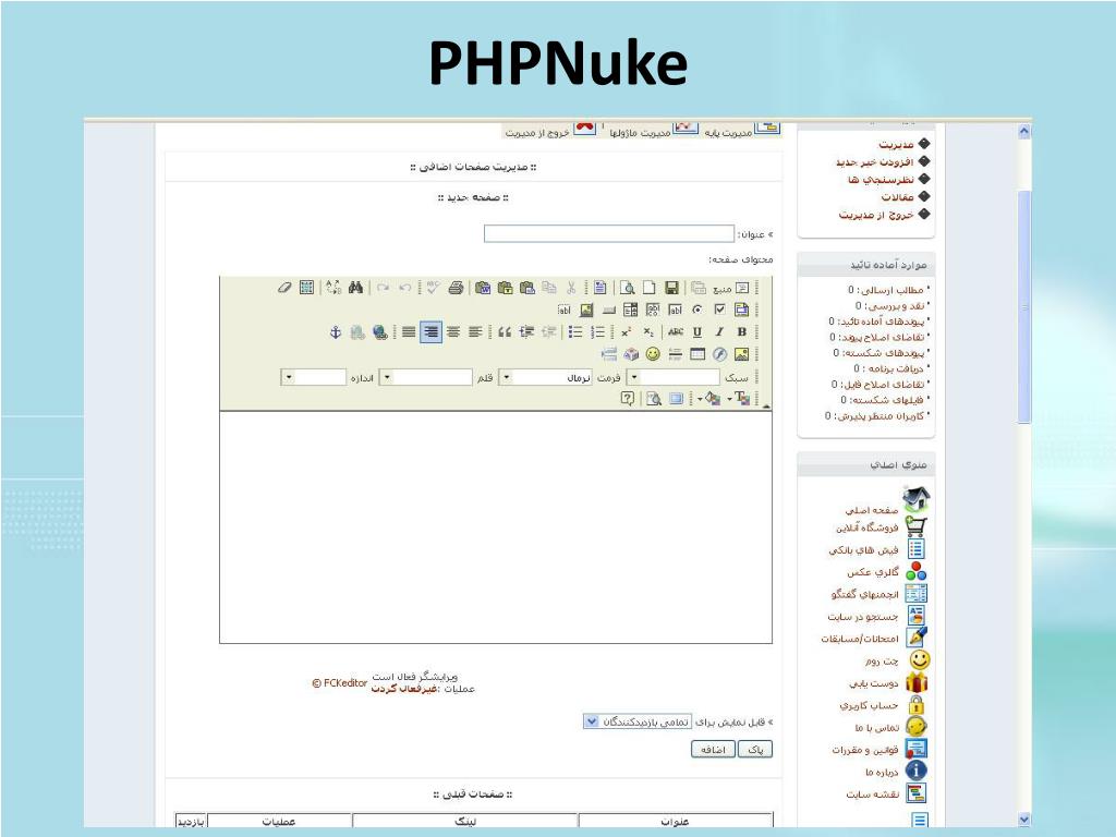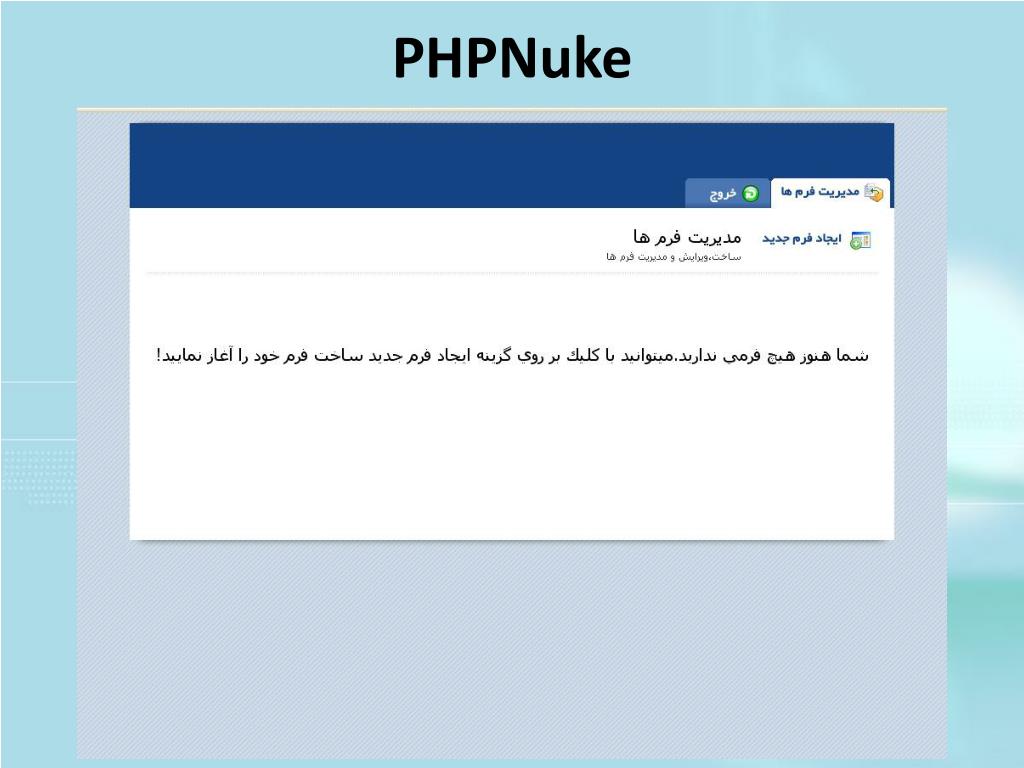 امکاناتPhp-Nuke • در Php-Nuke شما به راحتی میتوانید شروع به گرفتن عضو کنید و بر رویکاربران نظارت داشته باشید • .Php-Nukeاز یک انجمن قوی به نام phpbb استفادهمیکند که شما میتوانید به راحتی از آن استفاده کنید . • با چند کلیک میتوانیددر سایت خود نظر سنجی کامل و مستقل داشته باشید حتی برای خبرهای خود . • بهراحتی میتوانید برای اعضای خود خبرنامه ارسال کنید . • در هر لحظه میتوانید ازآمارهای مختلف سایت استفاده کنید ، تعدادبازدید صفحات ، تعداد خوانده شدن یک خبر و ...
