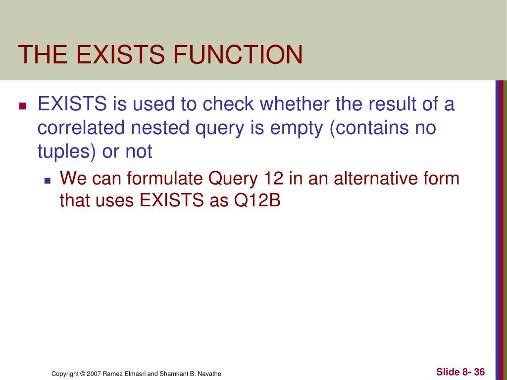 THE EXISTS FUNCTION • EXISTS is used to check whether the result of a correlated nested query is empty (contains no tuples) or not • We can formulate Query 12 in an alternative form that uses EXISTS as Q12B