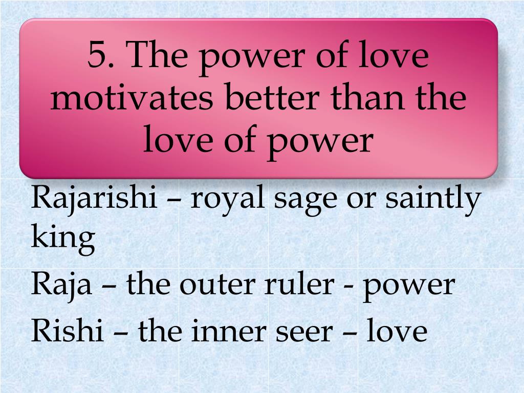 Rajarishi – royal sage or saintly king Raja – the outer ruler - power Rishi – the inner seer – love