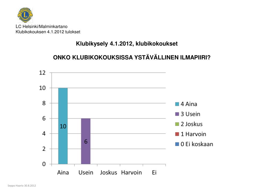 LC Helsinki/MalminkartanoKlubikokouksen 4.1.2012 tuloksetKlubikysely 4.1.2012, klubikokoukset ONKO KLUBIKOKOUKSISSA YSTÄVÄLLINEN ILMAPIIRI? Seppo Haario 30.8.2012