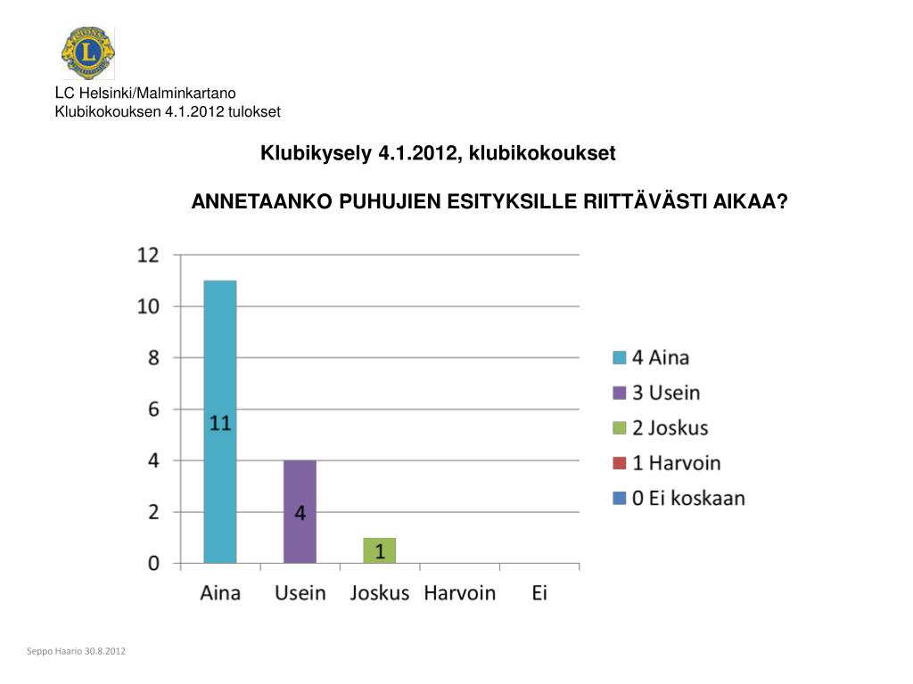 LC Helsinki/MalminkartanoKlubikokouksen 4.1.2012 tuloksetKlubikysely 4.1.2012, klubikokoukset ANNETAANKO PUHUJIEN ESITYKSILLE RIITTÄVÄSTI AIKAA? Seppo Haario 30.8.2012