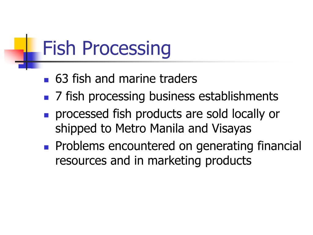 Fish Processing • 63 fish and marine traders • 7 fish processing business establishments • processed fish products are sold locally or shipped to Metro Manila and Visayas • Problems encountered on generating financial resources and in marketing products
