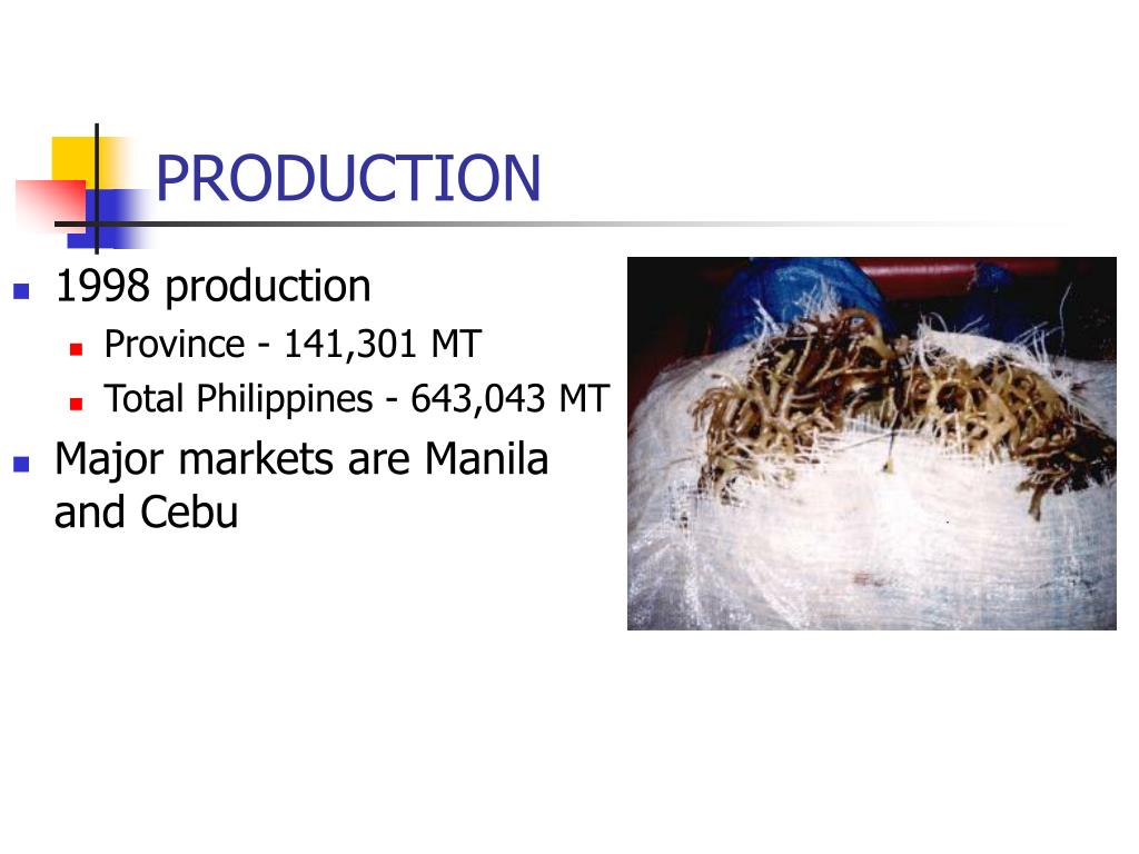 PRODUCTION • 1998 production • Province - 141,301 MT • Total Philippines - 643,043 MT • Major markets are Manila and Cebu