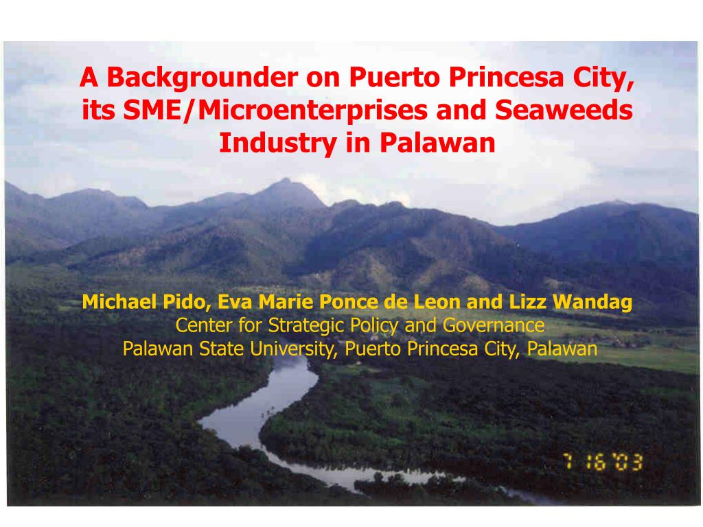A Backgrounder on Puerto Princesa City, its SME/Microenterprises and Seaweeds Industry in Palawan Michael Pido, Eva Marie Ponce de Leon and Lizz Wandag Center for Strategic Policy and Governance Palawan State University, Puerto Princesa City, Palawan