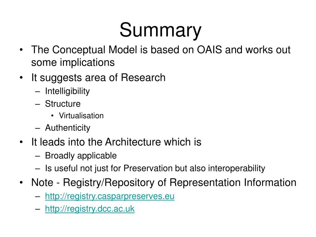 Summary • The Conceptual Model is based on OAIS and works out some implications • It suggests area of Research • Intelligibility • Structure • Virtualisation • Authenticity • It leads into the Architecture which is • Broadly applicable • Is useful not just for Preservation but also interoperability • Note - Registry/Repository of Representation Information • http://registry.casparpreserves.eu • http://registry.dcc.ac.uk