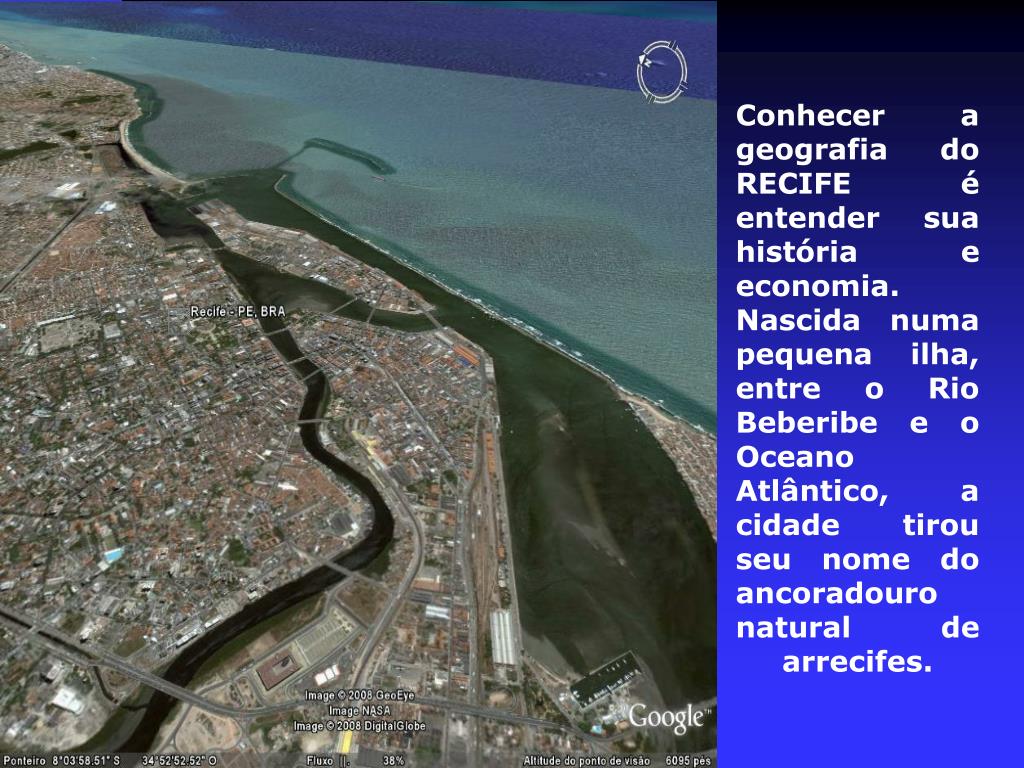 Conhecer a geografia do RECIFE é entender sua história e economia. Nascida numa pequena ilha, entre o Rio Beberibe e o Oceano Atlântico, a cidade tirou seu nome do ancoradouro natural de arrecifes.