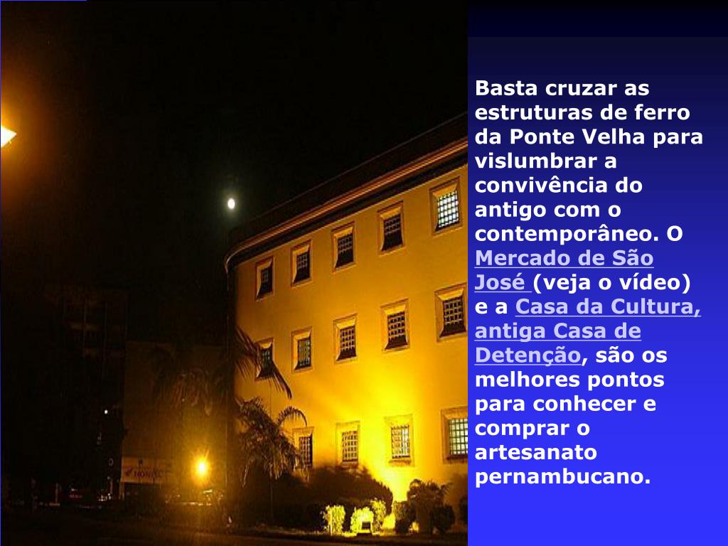 Basta cruzar as estruturas de ferro da Ponte Velha para vislumbrar a convivência do antigo com o contemporâneo. O Mercado de São José (veja o vídeo) e a Casa da Cultura, antiga Casa de Detenção, são os melhores pontos para conhecer e comprar o artesanato pernambucano.