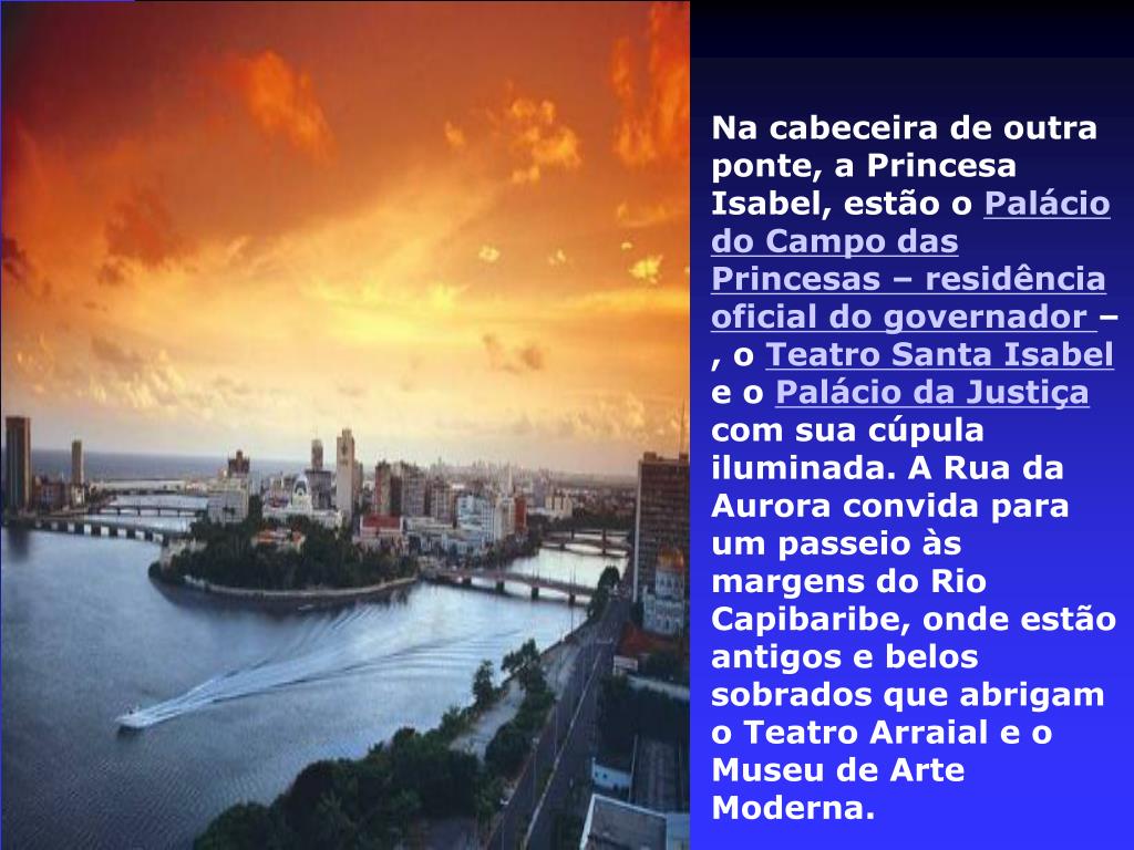 Na cabeceira de outra ponte, a Princesa Isabel, estão o Palácio do Campo das Princesas – residência oficial do governador –, o Teatro Santa Isabel e o Palácio da Justiça com sua cúpula iluminada. A Rua da Aurora convida para um passeio às margens do Rio Capibaribe, onde estão antigos e belos sobrados que abrigam o Teatro Arraial e o Museu de Arte Moderna.