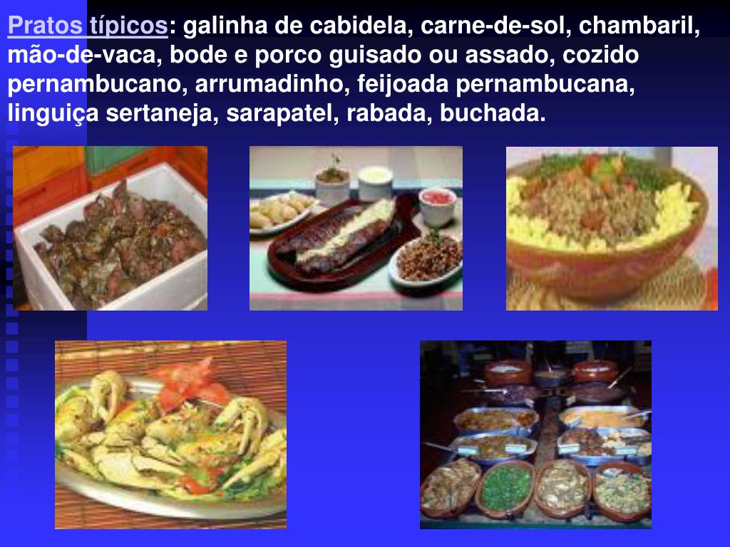 Pratos típicos: galinha de cabidela, carne-de-sol, chambaril, mão-de-vaca, bode e porco guisado ou assado, cozido pernambucano, arrumadinho, feijoada pernambucana, linguiça sertaneja, sarapatel, rabada, buchada.