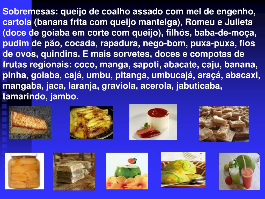 Sobremesas: queijo de coalho assado com mel de engenho, cartola (banana frita com queijo manteiga), Romeu e Julieta (doce de goiaba em corte com queijo), filhós, baba-de-moça, pudim de pão, cocada, rapadura, nego-bom, puxa-puxa, fios de ovos, quindins. E mais sorvetes, doces e compotas de frutas regionais: coco, manga, sapoti, abacate, caju, banana, pinha, goiaba, cajá, umbu, pitanga, umbucajá, araçá, abacaxi, mangaba, jaca, laranja, graviola, acerola, jabuticaba, tamarindo, jambo.
