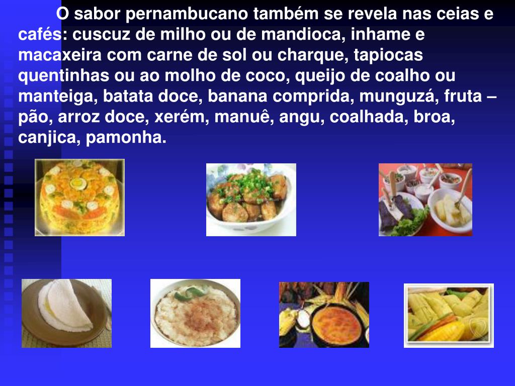 O sabor pernambucano também se revela nas ceias e cafés: cuscuz de milho ou de mandioca, inhame e macaxeira com carne de sol ou charque, tapiocas quentinhas ou ao molho de coco, queijo de coalho ou manteiga, batata doce, banana comprida, munguzá, fruta – pão, arroz doce, xerém, manuê, angu, coalhada, broa, canjica, pamonha.