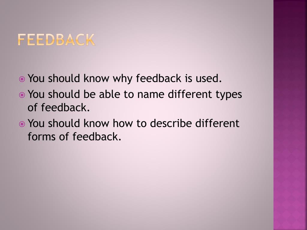 Feedback • You should know why feedback is used. • You should be able to name different types of feedback. • You should know how to describe different forms of feedback.