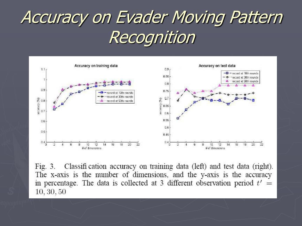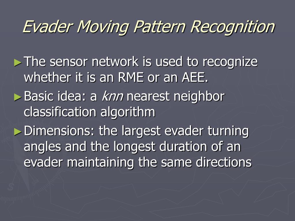 Evader Moving Pattern Recognition • The sensor network is used to recognize whether it is an RME or an AEE. • Basic idea: a knn nearest neighbor classification algorithm • Dimensions: the largest evader turning angles and the longest duration of an evader maintaining the same directions