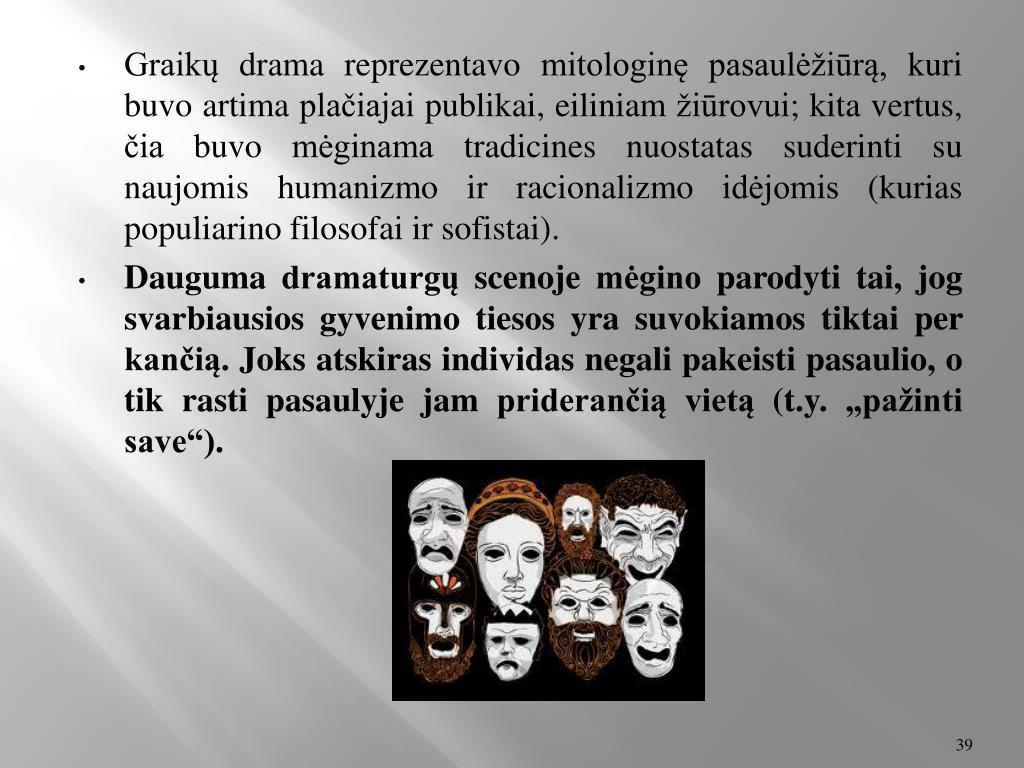 Graikų drama reprezentavo mitologinę pasaulėžiūrą, kuri buvo artima plačiajai publikai, eiliniam žiūrovui; kita vertus, čia buvo mėginama tradicines nuostatas suderinti su naujomis humanizmo ir racionalizmo idėjomis (kurias populiarino filosofai ir sofistai). • Dauguma dramaturgų scenoje mėgino parodyti tai, jog svarbiausios gyvenimo tiesos yra suvokiamos tiktai per kančią.Joks atskiras individas negali pakeisti pasaulio, o tik rasti pasaulyje jam priderančią vietą (t.y. „pažinti save“).