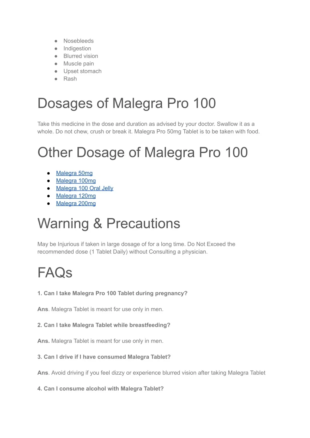● ● ● ● ● ● Nosebleeds Indigestion Blurred vision Muscle pain Upset stomach Rash Dosages of Malegra Pro 100 Take this medicine in the dose and duration as advised by your doctor. Swallow it as a whole. Do not chew, crush or break it. Malegra Pro 50mg Tablet is to be taken with food. Other Dosage of Malegra Pro 100 ● ● ● ● ● Malegra 50mg Malegra 100mg Malegra 100 Oral Jelly Malegra 120mg Malegra 200mg Warning & Precautions May be Injurious if taken in large dosage of for a long time. Do Not Exceed the recommended dose (1 Tablet Daily) without Consulting a physician. FAQs 1. Can I take Malegra Pro 100 Tablet during pregnancy? Ans. Malegra Tablet is meant for use only in men. 2. Can I take Malegra Tablet while breastfeeding? Ans. Malegra Tablet is meant for use only in men. 3. Can I drive if I have consumed Malegra Tablet? Ans. Avoid driving if you feel dizzy or experience blurred vision after taking Malegra Tablet 4. Can I consume alcohol with Malegra Tablet?