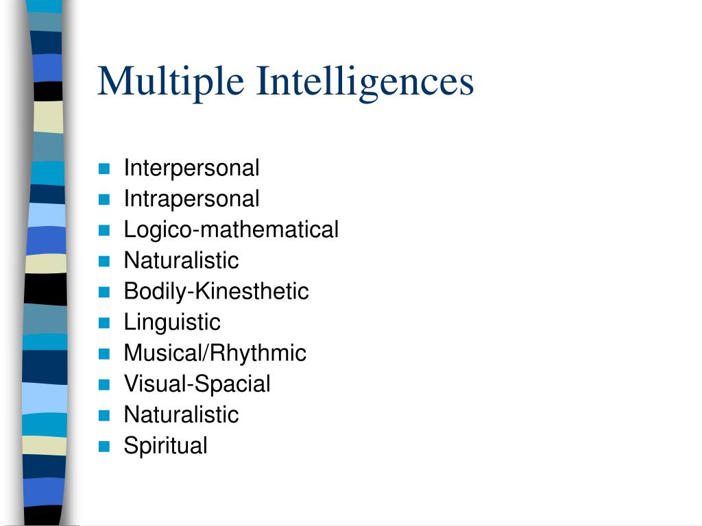 Multiple Intelligences • Interpersonal • Intrapersonal • Logico-mathematical • Naturalistic • Bodily-Kinesthetic • Linguistic • Musical/Rhythmic • Visual-Spacial • Naturalistic • Spiritual