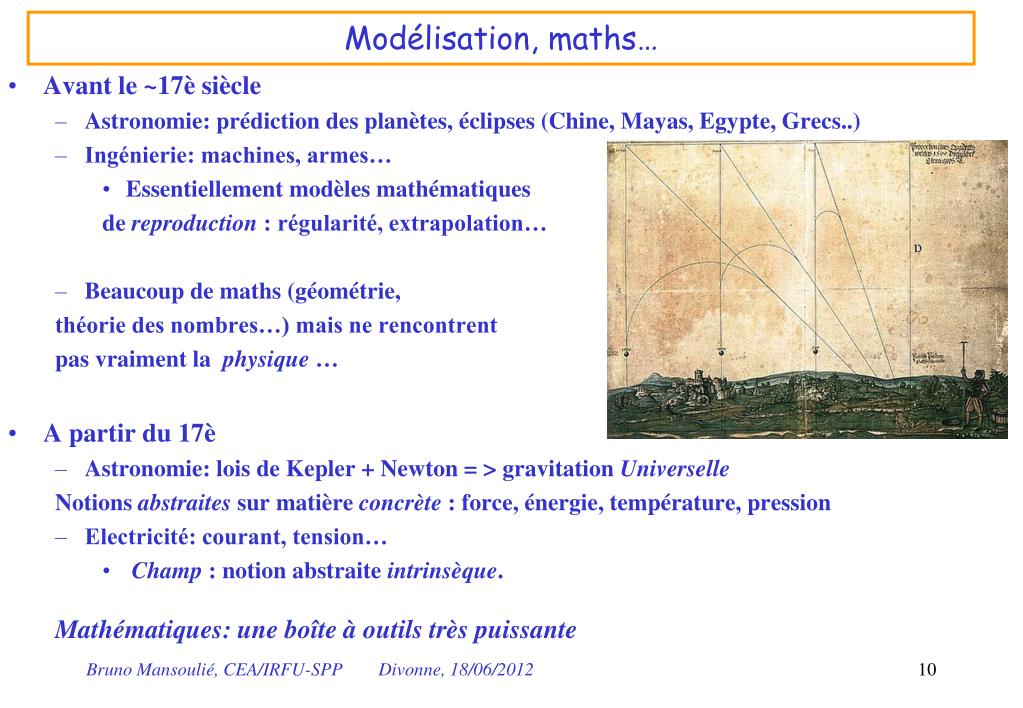 Modélisation, maths… • Avant le ~17è siècle • Astronomie: prédiction des planètes, éclipses (Chine, Mayas, Egypte, Grecs..) • Ingénierie: machines, armes… • Essentiellement modèles mathématiques de reproduction : régularité, extrapolation… • Beaucoup de maths (géométrie, théorie des nombres…) mais ne rencontrent pas vraiment la physique … • A partir du 17è • Astronomie: lois de Kepler + Newton = > gravitation Universelle Notions abstraites sur matière concrète : force, énergie, température, pression • Electricité: courant, tension… • Champ : notion abstraite intrinsèque. Mathématiques: une boîte à outils très puissante
