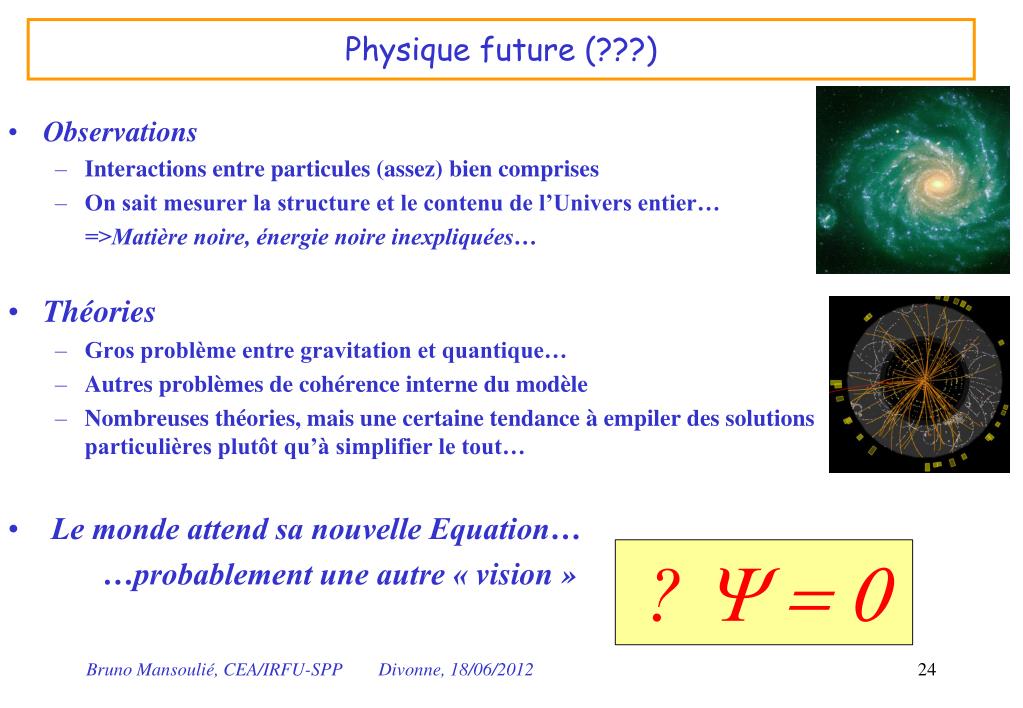 Physique future (???) • ? Y = 0 • Observations • Interactions entre particules (assez) bien comprises • On sait mesurer la structure et le contenu de l’Univers entier… =>Matière noire, énergie noire inexpliquées… • Théories • Gros problème entre gravitation et quantique… • Autres problèmes de cohérence interne du modèle • Nombreuses théories, mais une certaine tendance à empiler des solutions particulières plutôt qu’à simplifier le tout… • Le monde attend sa nouvelle Equation… …probablement une autre « vision »
