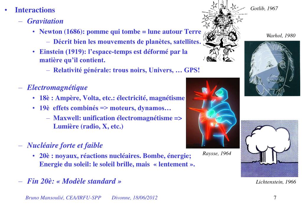 Gotlib, 1967 Warhol, 1980 Raysse, 1964 Lichtenstein, 1966 • Interactions • Gravitation • Newton (1686): pomme qui tombe = lune autour Terre! • Décrit bien les mouvements de planètes, satellites… • Einstein (1919): l’espace-temps est déformé par la matière qu’il contient. • Relativité générale: trous noirs, Univers, … GPS! • Electromagnétique • 18è : Ampère, Volta, etc.: électricité, magnétisme • 19è effets combinés => moteurs, dynamos… • Maxwell: unification électromagnétisme => Lumière (radio, X, etc.) • Nucléaire forte et faible • 20è : noyaux, réactions nucléaires. Bombe, énergie; Energie du soleil: le soleil brille, mais « lentement ». • Fin 20è: « Modèle standard »