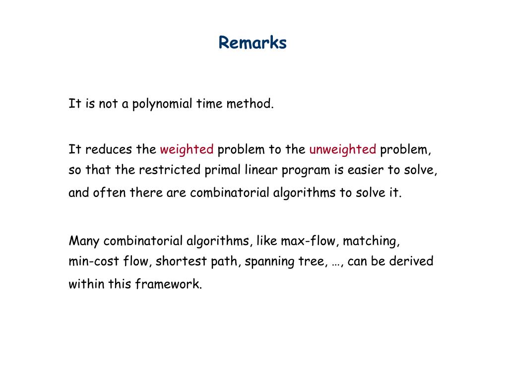 Remarks It is not a polynomial time method. It reduces the weighted problem to the unweighted problem, so that the restricted primal linear program is easier to solve, and often there are combinatorial algorithms to solve it. Many combinatorial algorithms, like max-flow, matching, min-cost flow, shortest path, spanning tree, …, can be derived within this framework.