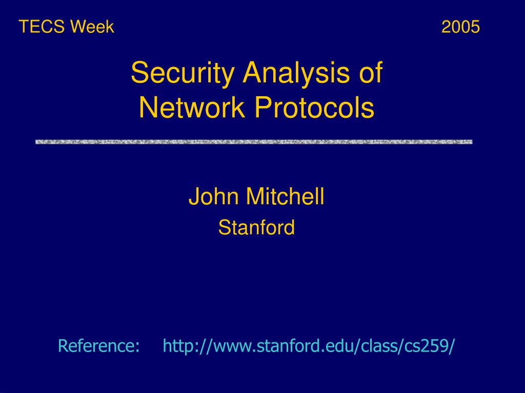 TECS Week. 2005. Security Analysis of Network Protocols. John Mitchell Stanford. Reference: http://www.stanford.edu/class/cs259/. Computer Security. Cryptography Encryption, signatures, cryptographic hash, … Security mechanisms Access control policy Network protocols