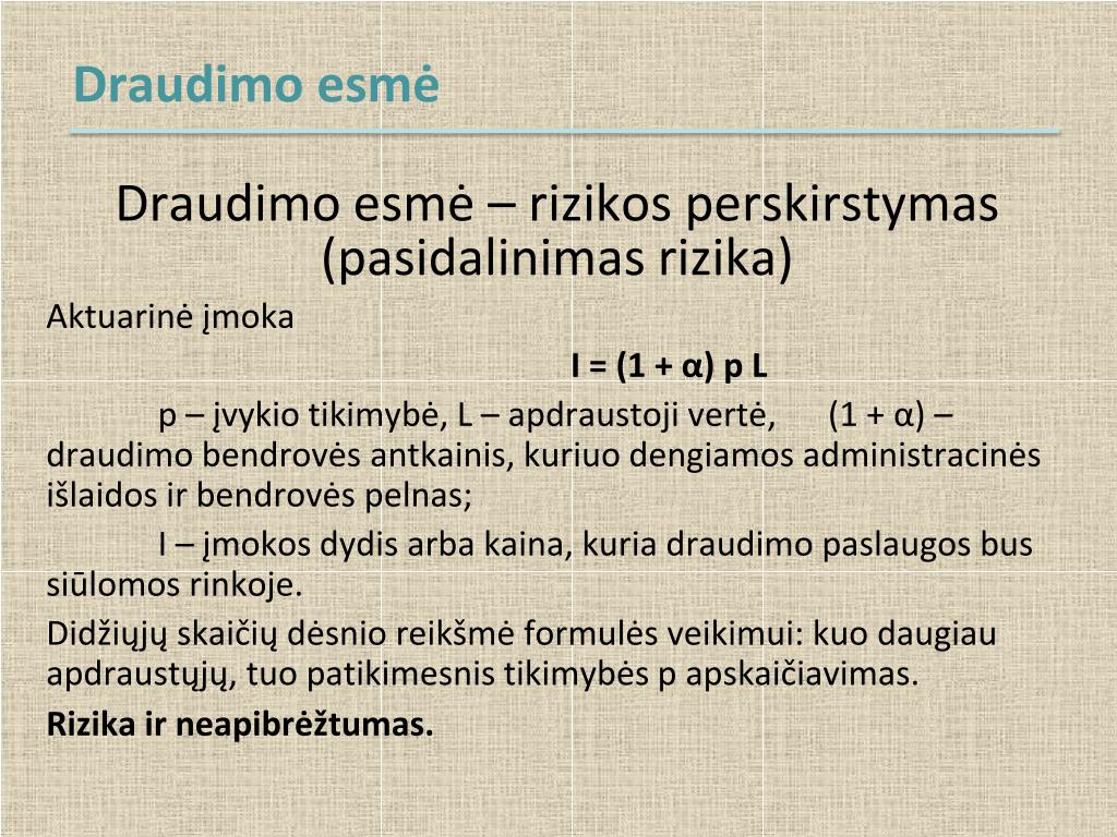 Draudimo esmė Draudimo esmė – rizikos perskirstymas (pasidalinimas rizika) Aktuarinė įmoka I = (1 + α) p L p – įvykio tikimybė, L – apdraustoji vertė, (1 + α) – draudimo bendrovės antkainis, kuriuo dengiamos administracinės išlaidos ir bendrovės pelnas; I – įmokos dydis arba kaina, kuria draudimo paslaugos bus siūlomos rinkoje. Didžiųjų skaičių dėsnio reikšmė formulės veikimui: kuo daugiau apdraustųjų, tuo patikimesnis tikimybės p apskaičiavimas. Rizika ir neapibrėžtumas.
