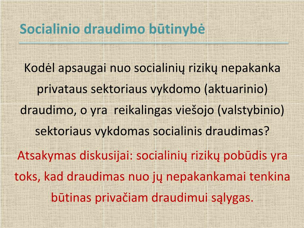 Socialinio draudimo būtinybė Kodėl apsaugai nuo socialinių rizikų nepakanka privataus sektoriaus vykdomo (aktuarinio) draudimo, o yra reikalingas viešojo (valstybinio) sektoriaus vykdomas socialinis draudimas? Atsakymas diskusijai: socialinių rizikų pobūdis yra toks, kad draudimas nuo jų nepakankamai tenkina būtinas privačiam draudimui sąlygas.