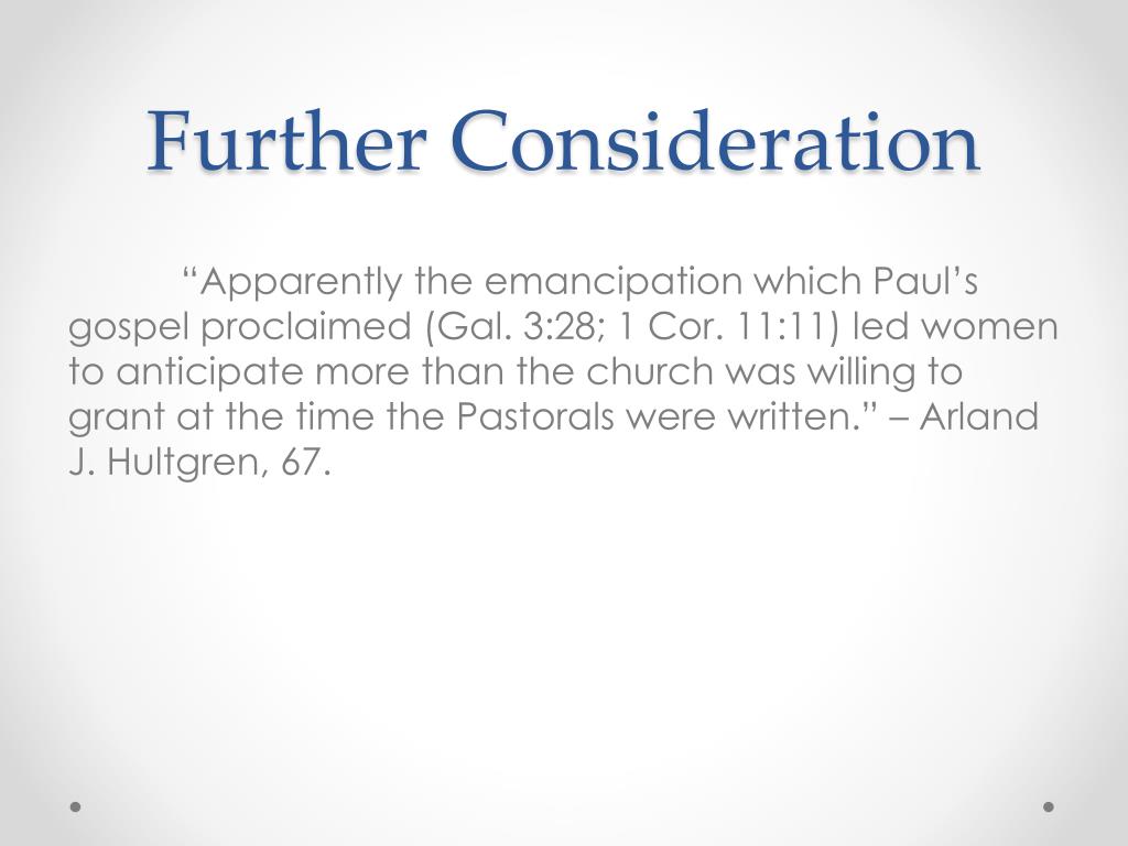 Further Consideration “Apparently the emancipation which Paul’s gospel proclaimed (Gal. 3:28; 1 Cor. 11:11) led women to anticipate more than the church was willing to grant at the time the Pastorals were written.” – Arland J. Hultgren, 67.