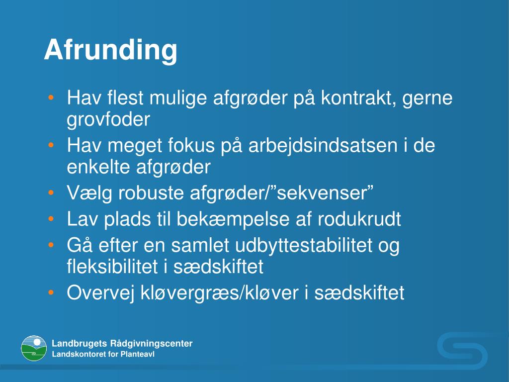 Afrunding • Hav flest mulige afgrøder på kontrakt, gerne grovfoder • Hav meget fokus på arbejdsindsatsen i de enkelte afgrøder • Vælg robuste afgrøder/”sekvenser” • Lav plads til bekæmpelse af rodukrudt • Gå efter en samlet udbyttestabilitet og fleksibilitet i sædskiftet • Overvej kløvergræs/kløver i sædskiftet