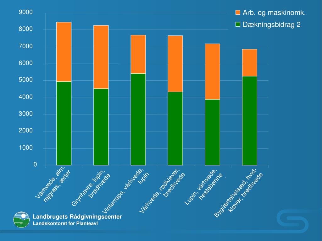 9000 Arb. og maskinomk. Dækningsbidrag 2 8000 7000 6000 5000 4000 3000 2000 1000 0 Vårhvede, alm. rajgræs, ærter Lupin, vårhvede, hestebønne Grynhavre, lupin, brødhvede Vinterraps, vårhvede, lupin Vårhvede, rødkløver, brødhvede Byg/ærtehelsæd, hvid-kløver, brødhvede