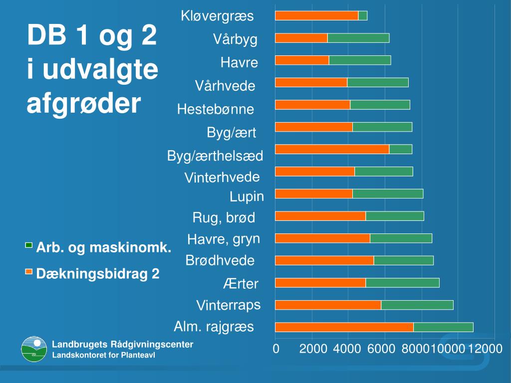 Kløvergræs Vårbyg Havre Vårhvede Hestebønne Byg/ært Byg/ærthelsæd Vinterhvede Lupin Rug, brød Havre, gryn Brødhvede Ærter Dækningsbidrag 2 Vinterraps Arb. og maskinomk. Alm. rajgræs DB 1 og 2 i udvalgte afgrøder 0 2000 4000 6000 8000 10000 12000