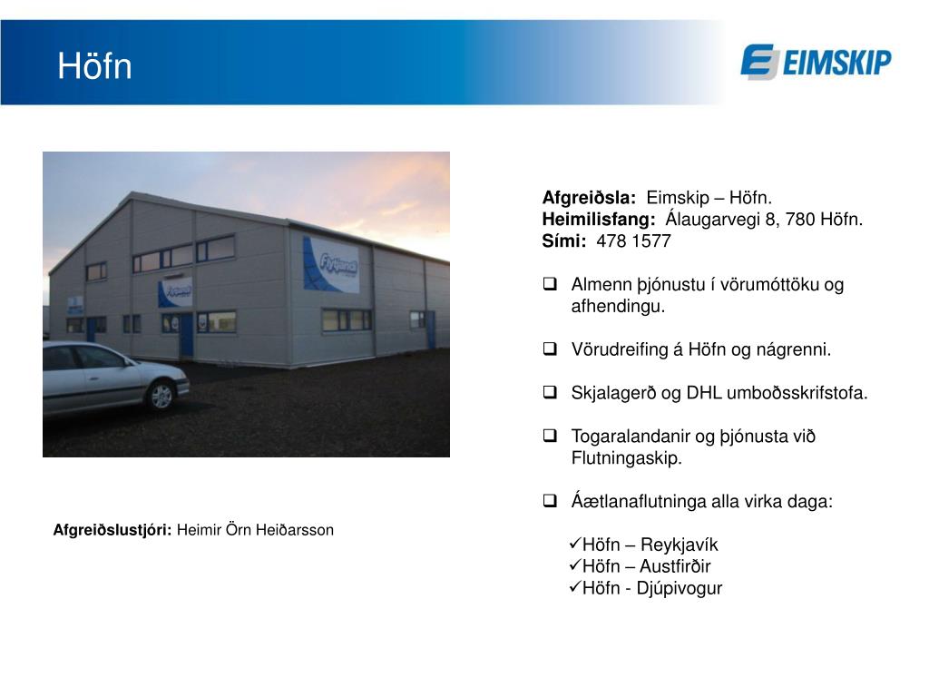 Höfn • Afgreiðsla: Eimskip – Höfn.Heimilisfang: Álaugarvegi 8, 780 Höfn.Sími: 478 1577 • Almenn þjónustu í vörumóttöku og afhendingu. • Vörudreifing á Höfn og nágrenni. • Skjalagerð og DHL umboðsskrifstofa. • Togaralandanir og þjónusta við Flutningaskip. • Áætlanaflutninga alla virka daga: • Höfn – Reykjavík • Höfn – Austfirðir • Höfn - Djúpivogur Afgreiðslustjóri: Heimir Örn Heiðarsson