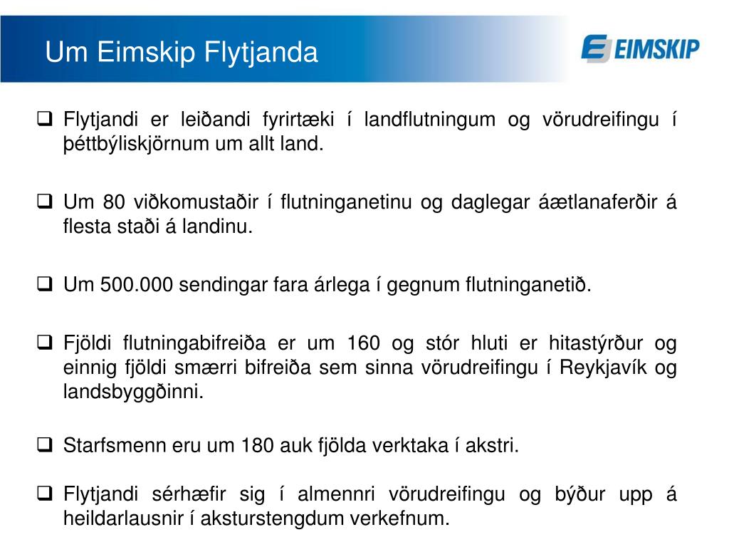 Eimskip Flytjandi Innanlandsflutningar. Um Eimskip Flytjanda. Flytjandi er leiðandi fyrirtæki í landflutningum og vörudreifingu í þéttbýliskjörnum um allt land. Um 80 viðkomustaðir í flutninganetinu og daglegar áætlanaferðir á flesta staði á landinu.