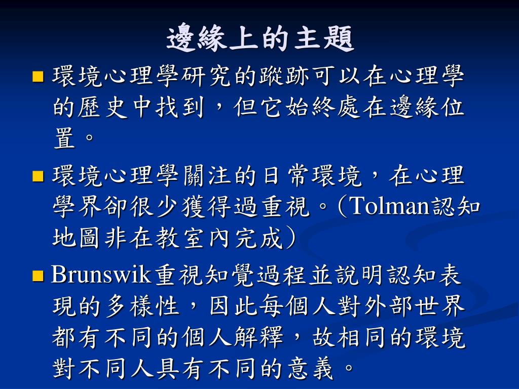 邊緣上的主題 環境心理學研究的蹤跡可以在心理學的歷史中找到,但它始終處在邊緣位置。 環境心理學關注的日常環境,在心理學界卻很少獲得過重視。(Tolman認知地圖非在教室內完成) Brunswik重視知覺過程並說明認知表現的多樣性,因此每個人對外部世界都有不同的個人解釋,故相同的環境對不同人具有不同的意義。