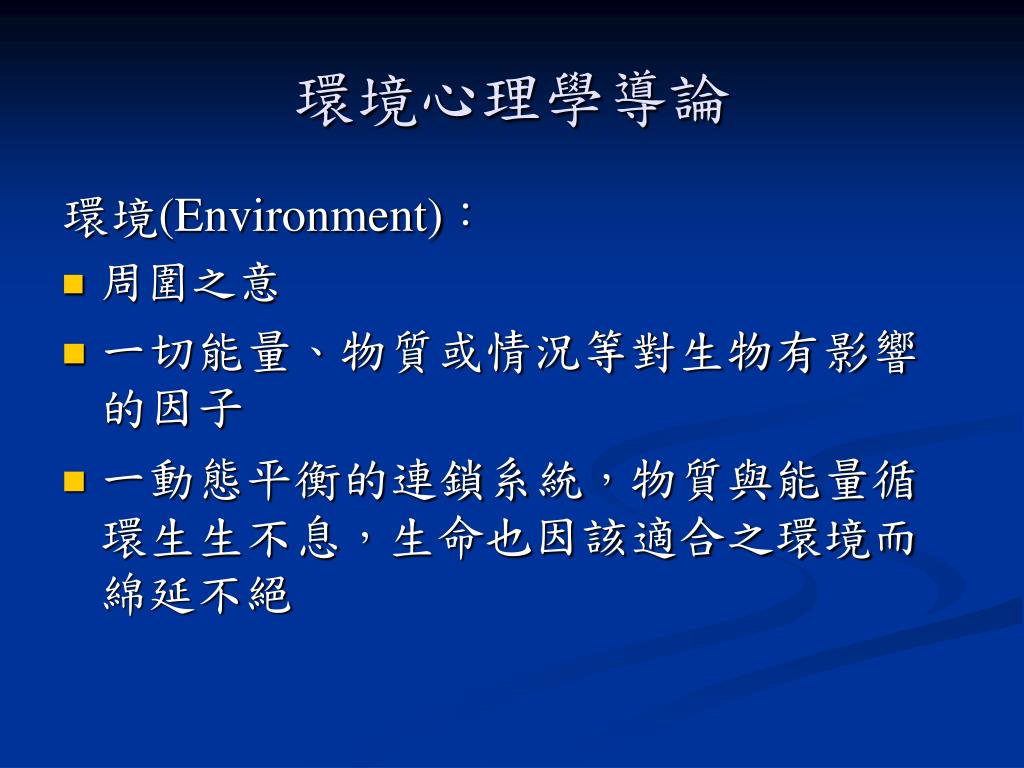 環境心理學導論 環境(Environment): • 周圍之意 • 一切能量、物質或情況等對生物有影響的因子 • 一動態平衡的連鎖系統,物質與能量循環生生不息,生命也因該適合之環境而綿延不絕