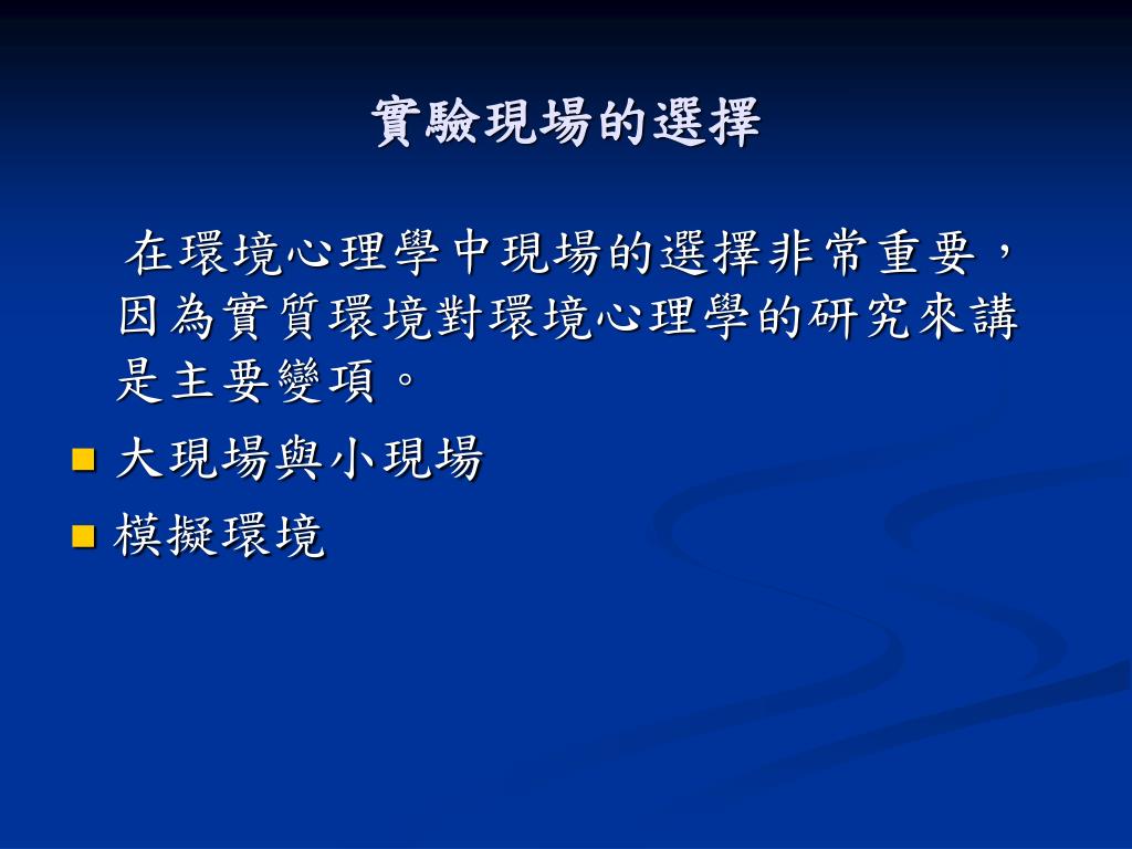 實驗現場的選擇 在環境心理學中現場的選擇非常重要,因為實質環境對環境心理學的研究來講是主要變項。 大現場與小現場 模擬環境