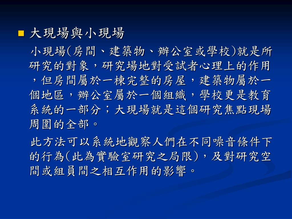 大現場與小現場 小現場(房間、建築物、辦公室或學校)就是所研究的對象,研究場地對受試者心理上的作用,但房間屬於一棟完整的房屋,建築物屬於一個地區,辦公室屬於一個組織,學校更是教育系統的一部分;大現場就是這個研究焦點現場周圍的全部。 此方法可以系統地觀察人們在不同噪音條件下的行為(此為實驗室研究之局限),及對研究空間或組員間之相互作用的影響。