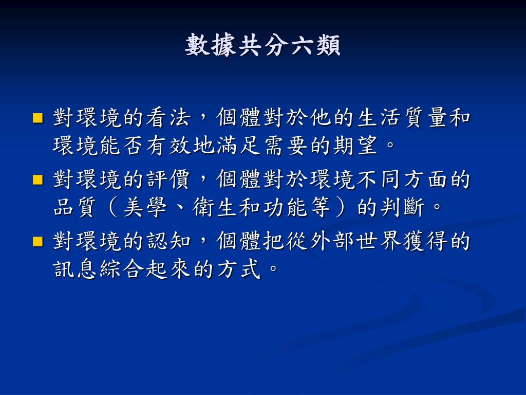 數據共分六類 對環境的看法,個體對於他的生活質量和環境能否有效地滿足需要的期望。 對環境的評價,個體對於環境不同方面的品質(美學、衛生和功能等)的判斷。 對環境的認知,個體把從外部世界獲得的訊息綜合起來的方式。