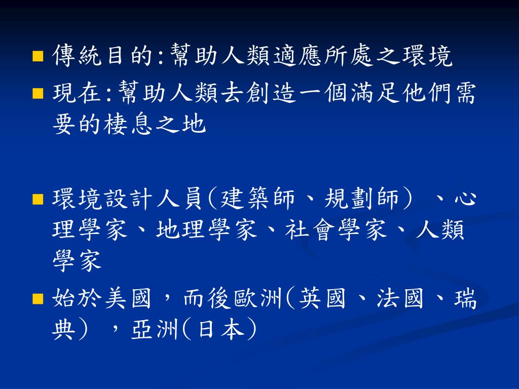 傳統目的:幫助人類適應所處之環境 • 現在:幫助人類去創造一個滿足他們需要的棲息之地 • 環境設計人員(建築師、規劃師) 、心理學家、地理學家、社會學家、人類學家 • 始於美國,而後歐洲(英國、法國、瑞典) ,亞洲(日本)
