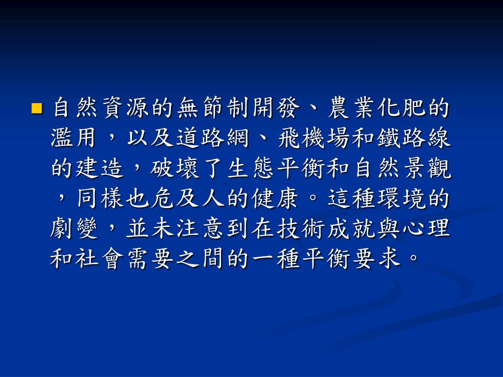 自然資源的無節制開發、農業化肥的濫用,以及道路網、飛機場和鐵路線的建造,破壞了生態平衡和自然景觀,同樣也危及人的健康。這種環境的劇變,並未注意到在技術成就與心理和社會需要之間的一種平衡要求。自然資源的無節制開發、農業化肥的濫用,以及道路網、飛機場和鐵路線的建造,破壞了生態平衡和自然景觀,同樣也危及人的健康。這種環境的劇變,並未注意到在技術成就與心理和社會需要之間的一種平衡要求。