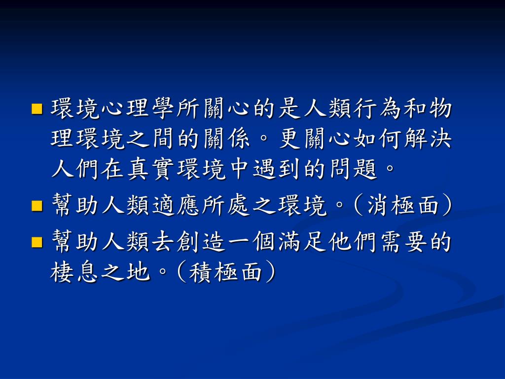 環境心理學所關心的是人類行為和物理環境之間的關係。更關心如何解決人們在真實環境中遇到的問題。環境心理學所關心的是人類行為和物理環境之間的關係。更關心如何解決人們在真實環境中遇到的問題。 幫助人類適應所處之環境。(消極面) 幫助人類去創造一個滿足他們需要的棲息之地。(積極面)