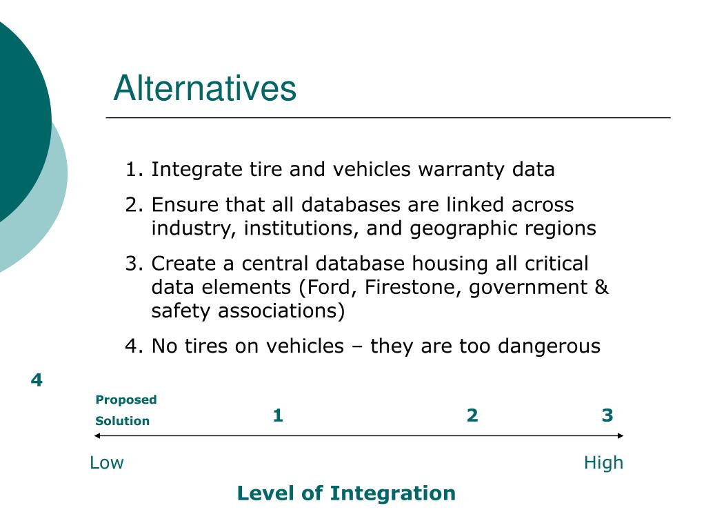 Alternatives • Integrate tire and vehicles warranty data • Ensure that all databases are linked across industry, institutions, and geographic regions • Create a central database housing all critical data elements (Ford, Firestone, government & safety associations) • No tires on vehicles – they are too dangerous 4 Proposed Solution 1 2 3 Low High Level of Integration