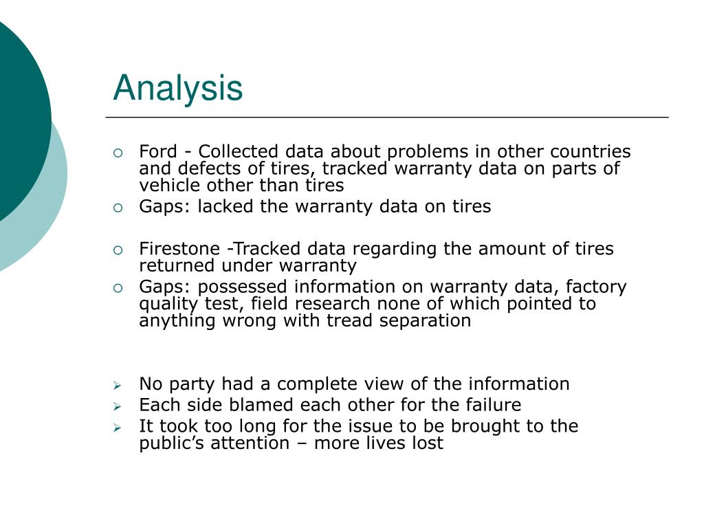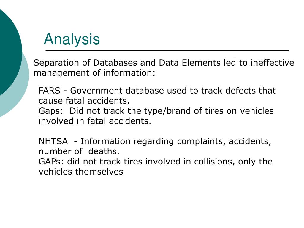 Analysis Separation of Databases and Data Elements led to ineffective management of information: FARS - Government database used to track defects that cause fatal accidents. Gaps: Did not track the type/brand of tires on vehicles involved in fatal accidents. NHTSA - Information regarding complaints, accidents, number of deaths. GAPs: did not track tires involved in collisions, only the vehicles themselves