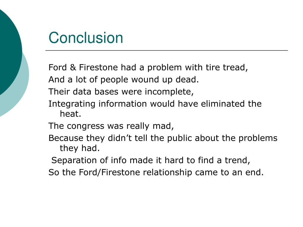 Conclusion Ford & Firestone had a problem with tire tread, And a lot of people wound up dead. Their data bases were incomplete, Integrating information would have eliminated the heat. The congress was really mad, Because they didn’t tell the public about the problems they had. Separation of info made it hard to find a trend, So the Ford/Firestone relationship came to an end.
