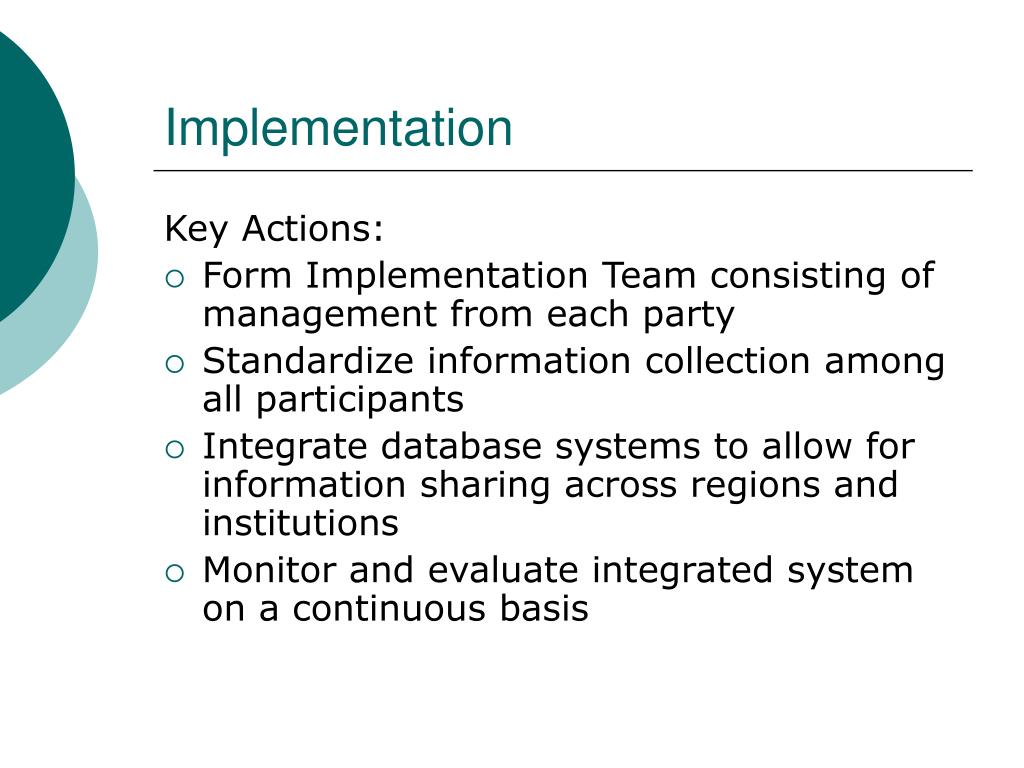 Implementation Key Actions: • Form Implementation Team consisting of management from each party • Standardize information collection among all participants • Integrate database systems to allow for information sharing across regions and institutions • Monitor and evaluate integrated system on a continuous basis