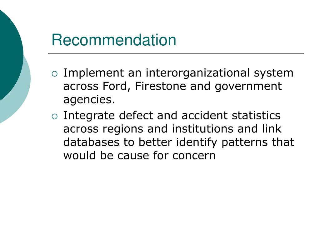 Recommendation • Implement an interorganizational system across Ford, Firestone and government agencies. • Integrate defect and accident statistics across regions and institutions and link databases to better identify patterns that would be cause for concern
