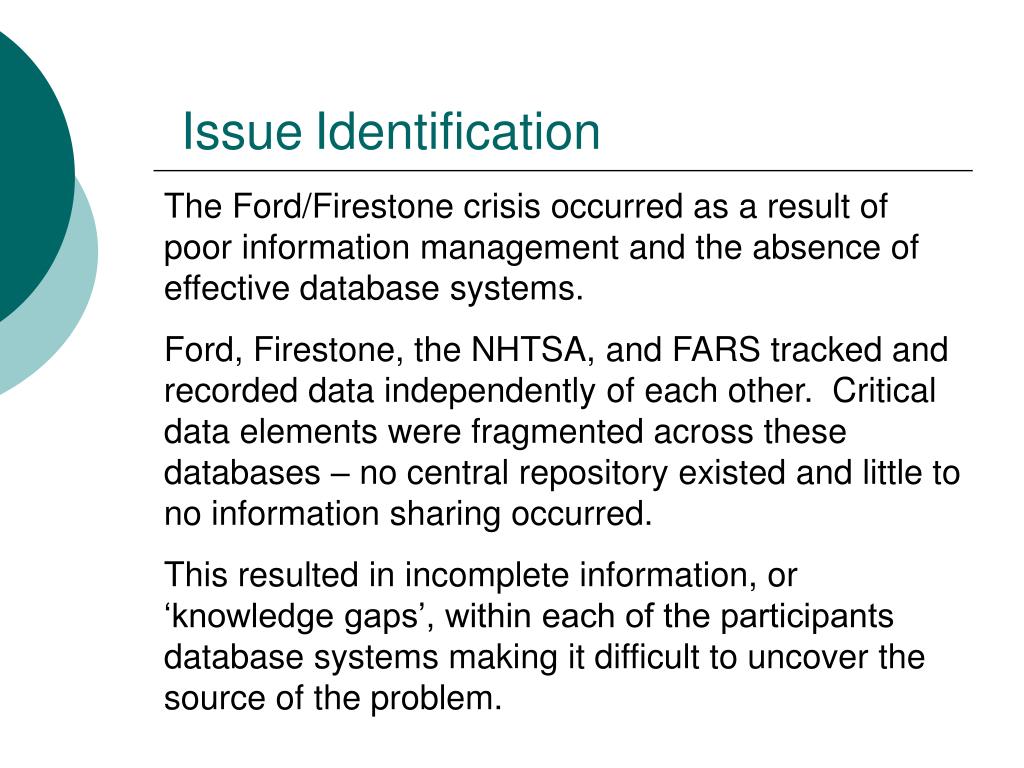 IssueIdentification The Ford/Firestone crisis occurred as a result of poor information management and the absence of effective database systems. Ford, Firestone, the NHTSA, and FARS tracked and recorded data independently of each other. Critical data elements were fragmented across these databases – no central repository existed and little to no information sharing occurred. This resulted in incomplete information, or ‘knowledge gaps’, within each of the participants database systems making it difficult to uncover the source of the problem.