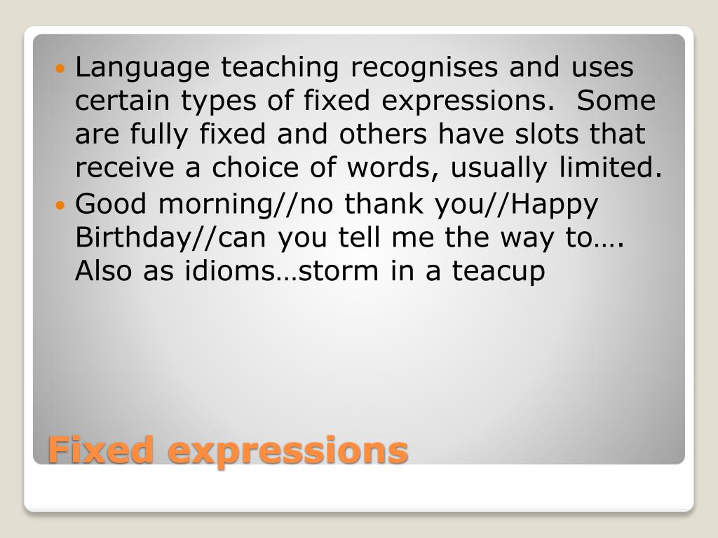 Language teaching recognises and uses certain types of fixed expressions. Some are fully fixed and others have slots that receive a choice of words, usually limited. • Good morning//no thank you//Happy Birthday//can you tell me the way to…. Also as idioms…storm in a teacup Fixed expressions