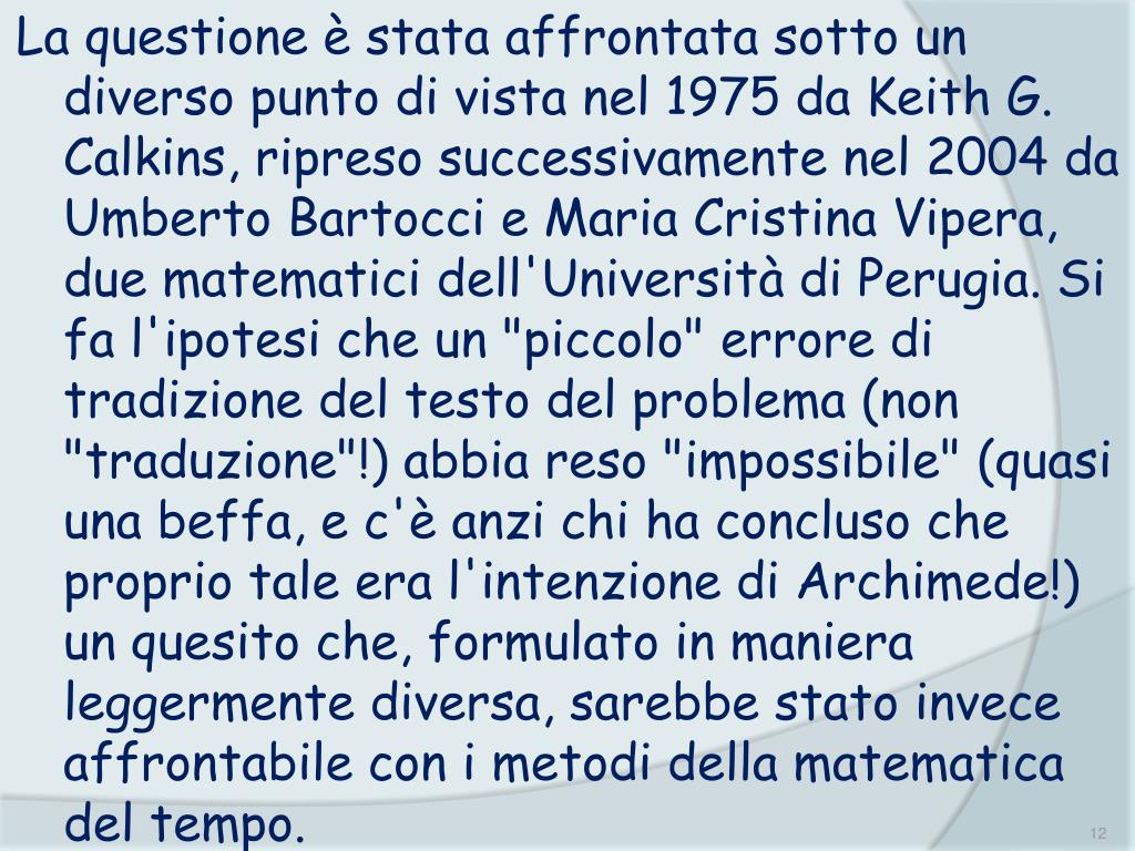 La questione è stata affrontata sotto un diverso punto di vista nel 1975 da Keith G. Calkins, ripreso successivamente nel 2004 da Umberto Bartocci e Maria Cristina Vipera, due matematici dell'Università di Perugia. Si fa l'ipotesi che un "piccolo" errore di tradizione del testo del problema (non "traduzione"!) abbia reso "impossibile" (quasi una beffa, e c'è anzi chi ha concluso che proprio tale era l'intenzione di Archimede!) un quesito che, formulato in maniera leggermente diversa, sarebbe stato invece affrontabile con i metodi della matematica del tempo.