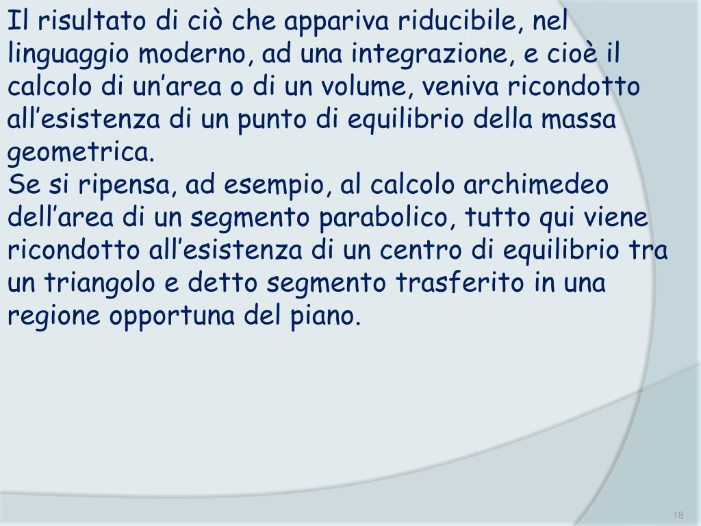 Il risultato di ciò che appariva riducibile, nel linguaggio moderno, ad una integrazione, e cioè il calcolo di un’area o di un volume, veniva ricondotto all’esistenza di un punto di equilibrio della massa geometrica. Se si ripensa, ad esempio, al calcolo archimedeo dell’area di un segmento parabolico, tutto qui viene ricondotto all’esistenza di un centro di equilibrio tra un triangolo e detto segmento trasferito in una regione opportuna del piano.